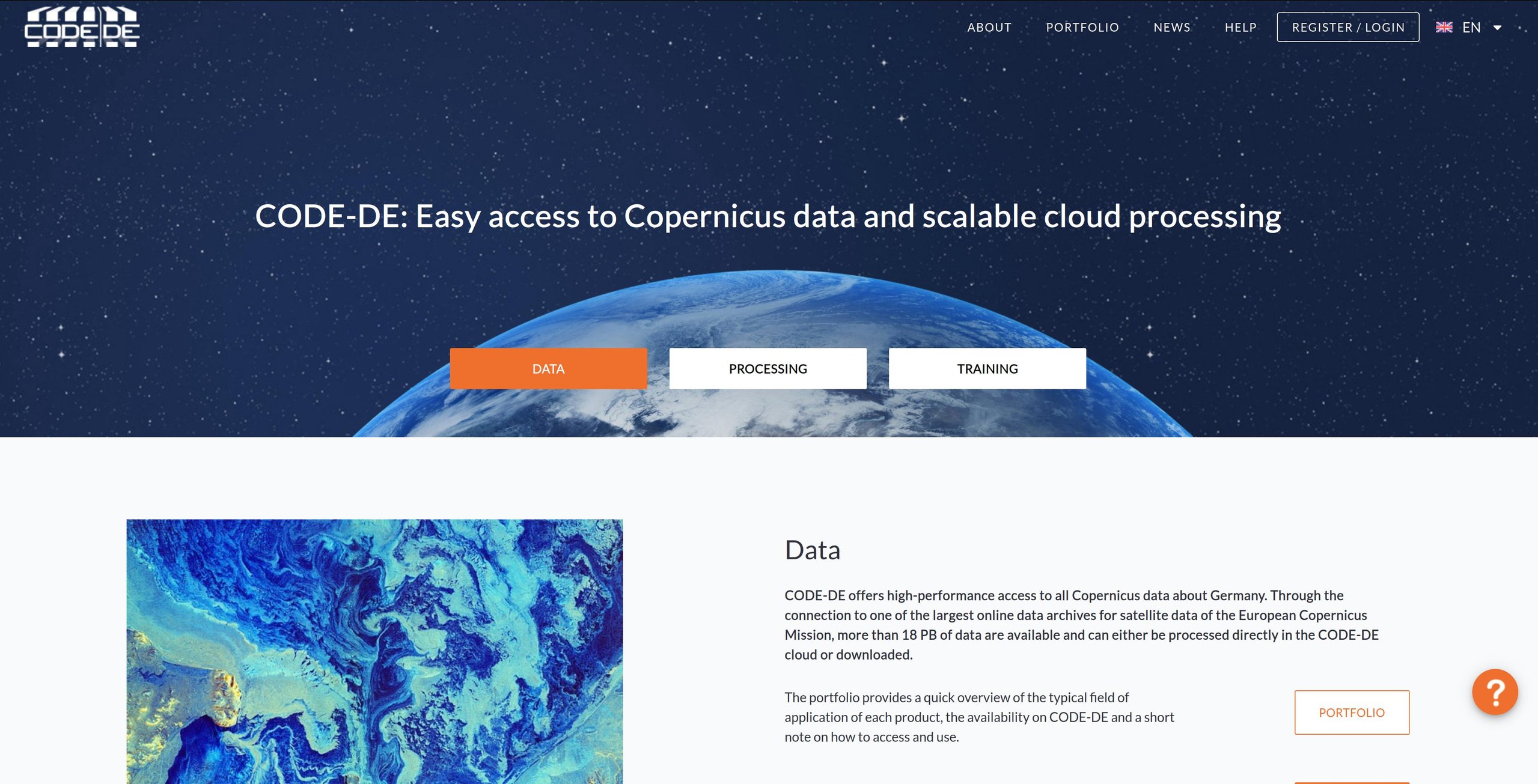 CODE-DE offers high-performance access to all Copernicus data about Germany. Through the connection to one of the largest online data archives for satellite data of the European Copernicus Mission, more than 18 PB of data are available and can either be processed directly in the CODE-DE cloud or downloaded.