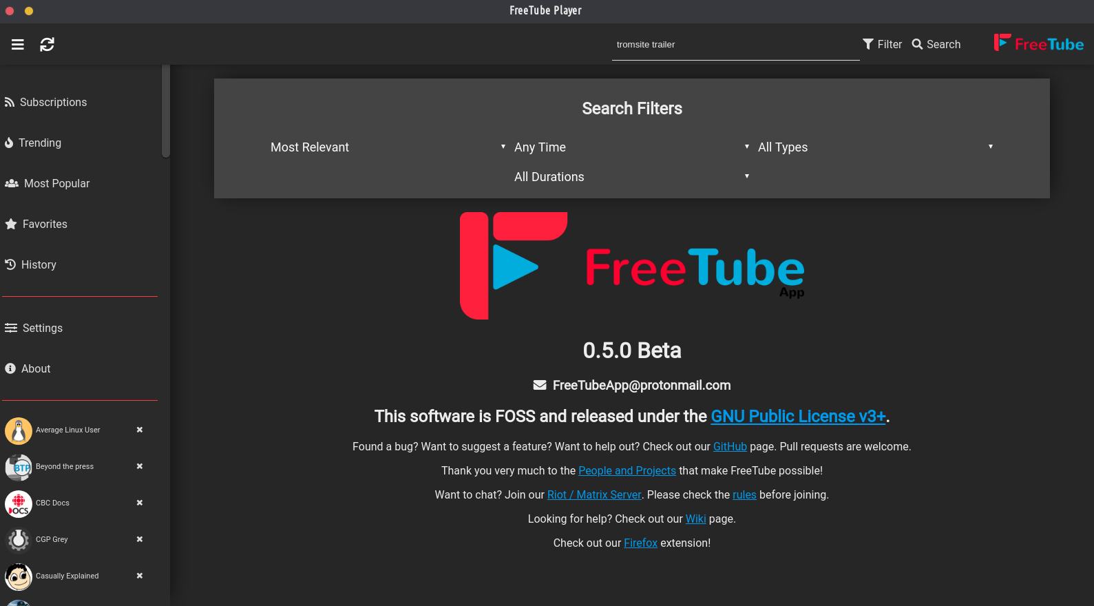 FreeTube is an open source desktop YouTube player built with privacy in mind. Use YouTube without advertisements and prevent Google from tracking you with their cookies and JavaScript. Available for Windows, Mac & Linux thanks to Electron. Please note that FreeTube is currently in Beta. While it should work well for most users, there are still bugs and missing features that need to be addressed.