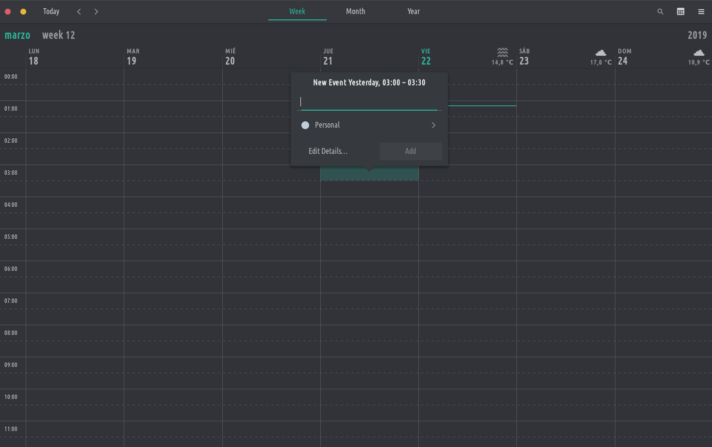 GNOME Calendar is a simple and beautiful calendar application designed to perfectly fit the GNOME desktop. By reusing the components which the GNOME desktop is build on, Calendar nicely integrates with the GNOME ecosystem.