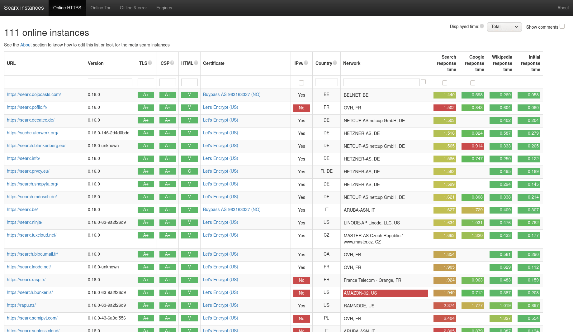 This website shows the searx public instances. It is updated every 24 hours, except the response times which are updated every 3 hours. It requires Javascript until the issue #9 is fixed. Searx is a free internet metasearch engine which aggregates results from more than 70 search services. Users are neither tracked nor profiled. Public instances listed here may yield less accurate results as they have much higher traffic and consequently have a higher chance of being blocked by search providers such as Google, Qwant, Bing, Startpage, etc. Hosting your own instance or using an instance that isn’t listed here may give you a more consistent search experience.