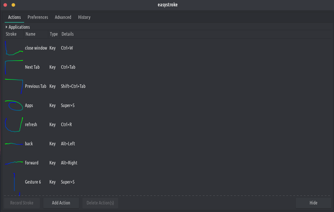 Easystroke is a gesture-recognition application for X11. Gestures or strokes are movements that you make with you mouse (or your pen, finger etc.) while holding down a specific mouse button. Easystroke will execute certain actions if it recognizes the stroke; currently easystroke can emulate key presses, execute shell commands, hold down modifiers and emulate a scroll wheel. The program was designed with Tablet PCs in mind and can be used effectively even without access to a keyboard. Easystroke tries to provide an intuitive and efficient user interface, while at the same time being highly configurable and offering many advanced features.