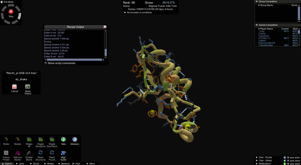 Foldit is an online puzzle video game about protein folding. It is part of an experimental research project developed by the University of Washington, Center for Game Science, in collaboration with the UW Department of Biochemistry. The objective of Foldit is to fold the structures of selected proteins as perfectly as possible, using tools provided in the game. The highest scoring solutions are analyzed by researchers, who determine whether or not there is a native structural configuration (native state) that can be applied to relevant proteins in the real world. Scientists can then use these solutions to target and eradicate diseases and create biological innovations. A 2010 paper in the science journal Nature credited Foldit’s 57,000 players with providing useful results that matched or outperformed algorithmically computed solutions.