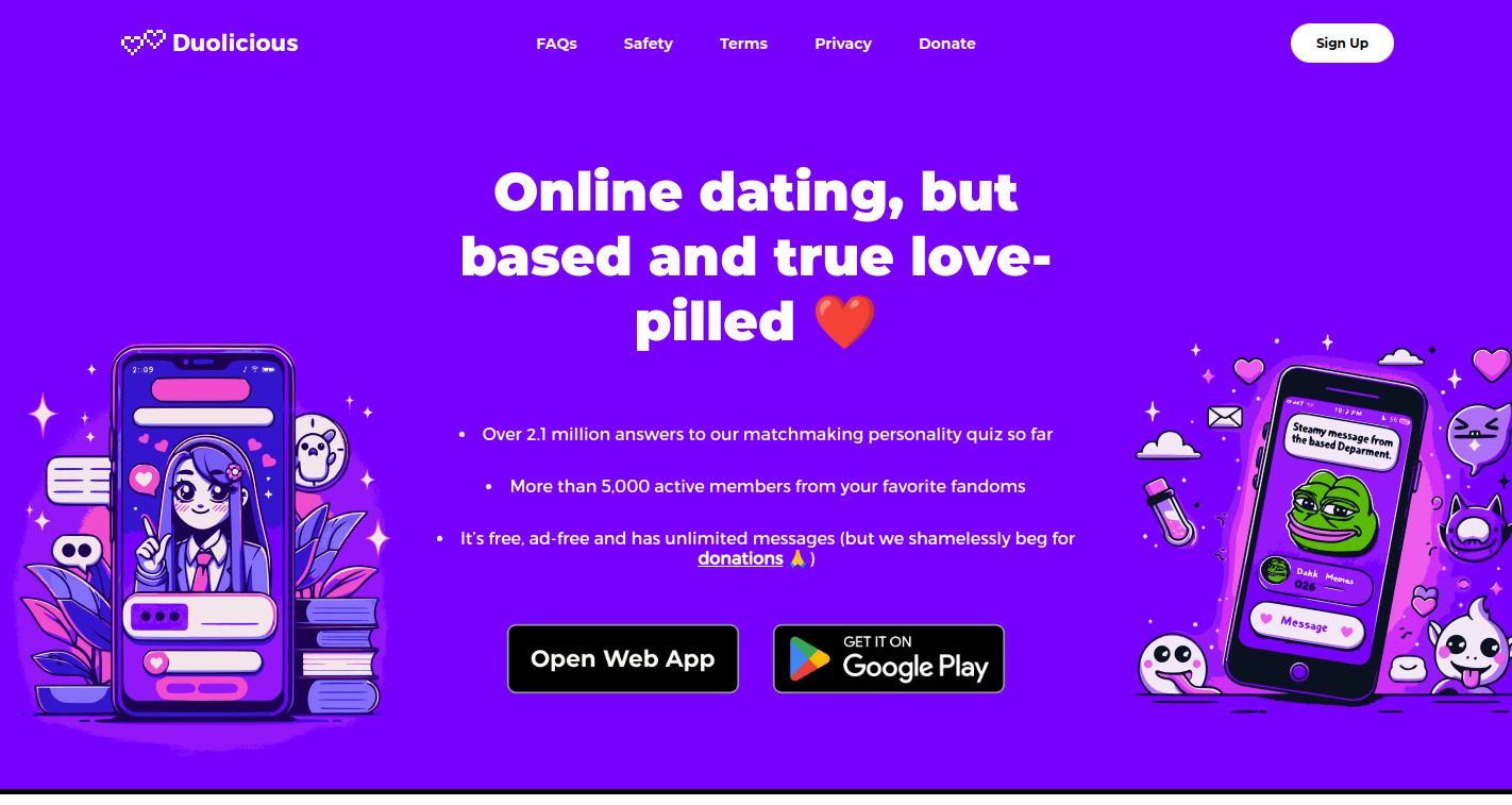 Duolicious is a personality-based dating app for meeting like-minded people. Duolicious has a question bank containing over 2000 thoughtful and unique questions designed to help us gain authentic insight into your personality—But you don’t need to answer them all to find your perfect match! Right after your first response, Duolicious shows your best matches so far—And the matches get better with every response you give. The questions are fun and easy-to-answer, while still giving the depth of insight Duolicious needs to match you with the right people. Our question bank covers a huge variety of topics, including values, faith, politics and sexual compatibility.