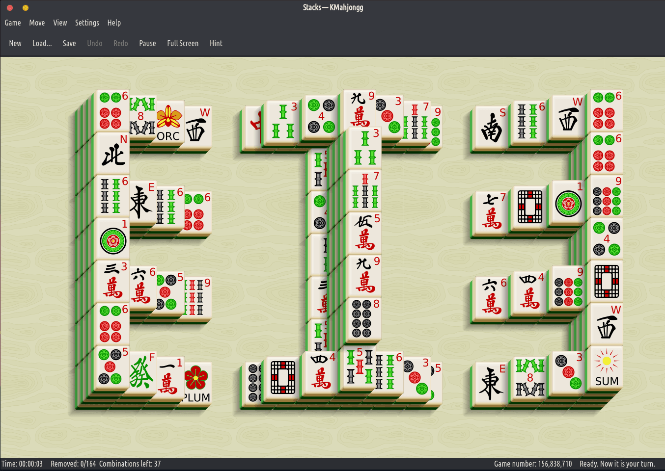 In KMahjongg the tiles are scrambled and staked on top of each other to resemble a certain shape. The player is then expected to remove all the tiles off the game board by locating each tile’s matching pair.