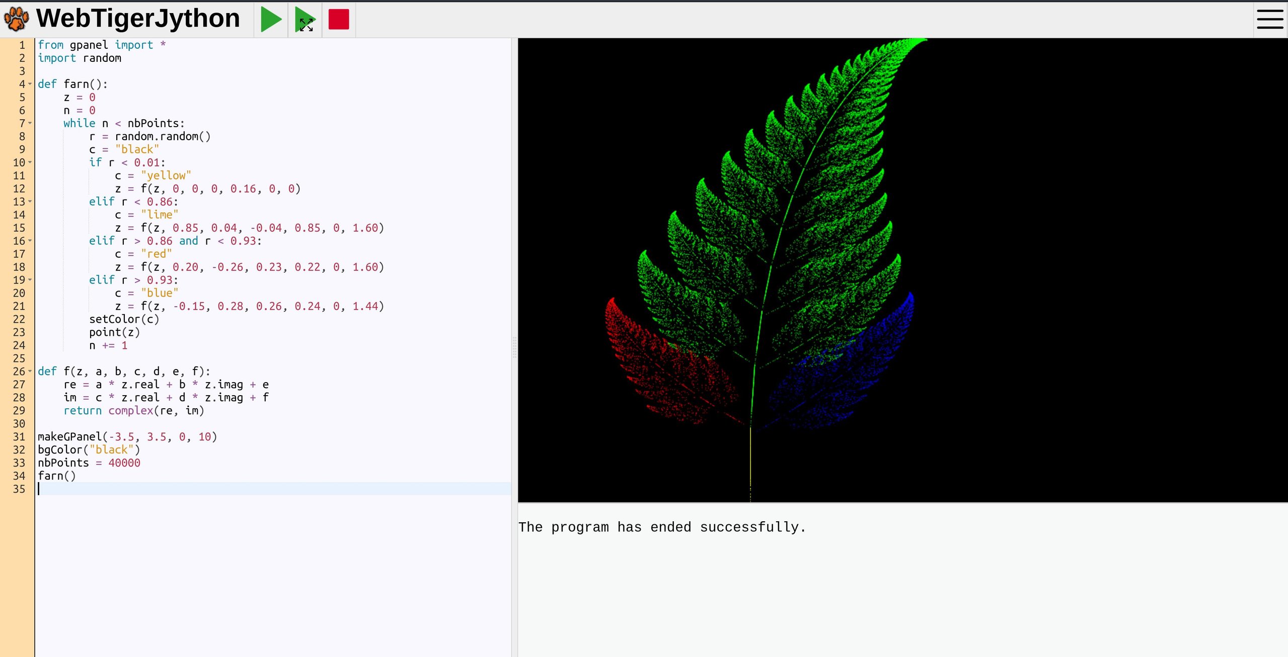 WebTigerJython is a student friendly programming environment for the Python programming language. The learning environment is designed especially for school lessons with the textbook “Einfach Informatik: Programmieren 7-9” from Juraj Hromkovič and Tobias Kohn published by Klett & Balmer.