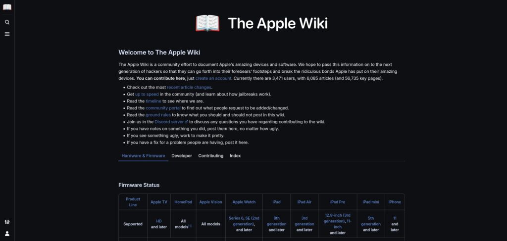 The Apple Wiki is a community effort to document Apple’s amazing devices and software. We hope to pass this information on to the next generation of hackers so that they can go forth into their forebears’ footsteps and break the ridiculous bonds Apple has put on their amazing devices. You can contribute here, just create an account. Currently there are 3,471 users, with 6,085 articles (and 56,735 key pages).