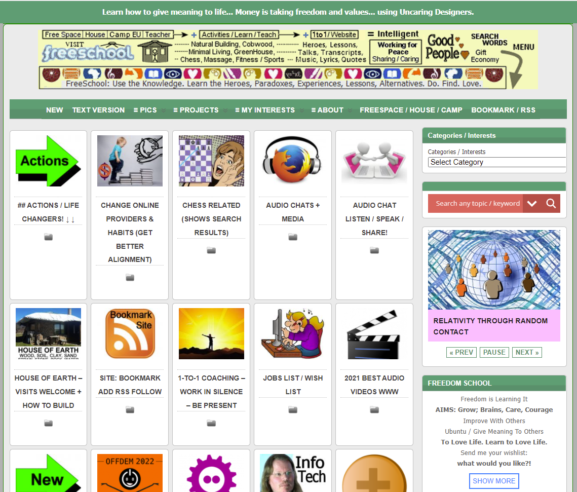 Free education and different ways of working either on our own or together. Learning individually and together. And then switching between the two. Teacher and student. Remaining flexible. Gaining a higher average insight to life and it’s many subjects not just from one field of research / teaching / learning. Finding different the various techniques in life. I considered the direct / well-researched ways of learning… or ‘hard and fast’ / monotonous learning from can be more obvious and less frustrating, however a little unreal in terms of reality and touching things. Finding and becoming a good student, not just from a teacher or book! On the other side becoming a good teacher also from your students. Working for one’s self and the next generation at the same time as teaching… so not just teaching what a text book says but living and showing how the future can be and maybe more options. Many types of Free School’s may have come and gone in some form (since about 1960’s as far as I can see now) but perhaps now (in the present day) it’s more possible to capture and present data (although using technology and language I still think we are using more energy than using well or saving via knowledge)…