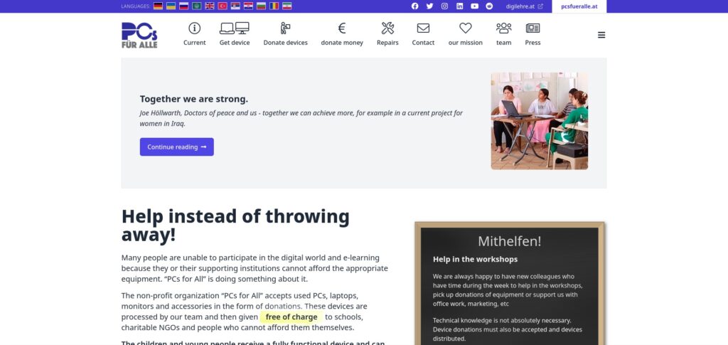 Help instead of throwing away! Many people are unable to participate in the digital world and e-learning because they or their supporting institutions cannot afford the appropriate equipment. “PCs for All” is doing something about it. The non-profit organization “PCs for All” accepts used PCs, laptops, monitors and accessories in the form of donations. These devices are processed by our team and then given free of charge to schools, charitable NGOs and people who cannot afford them themselves. The children and young people receive a fully functional device and can learn more easily for school, become smart and keep in touch with their family and friends.